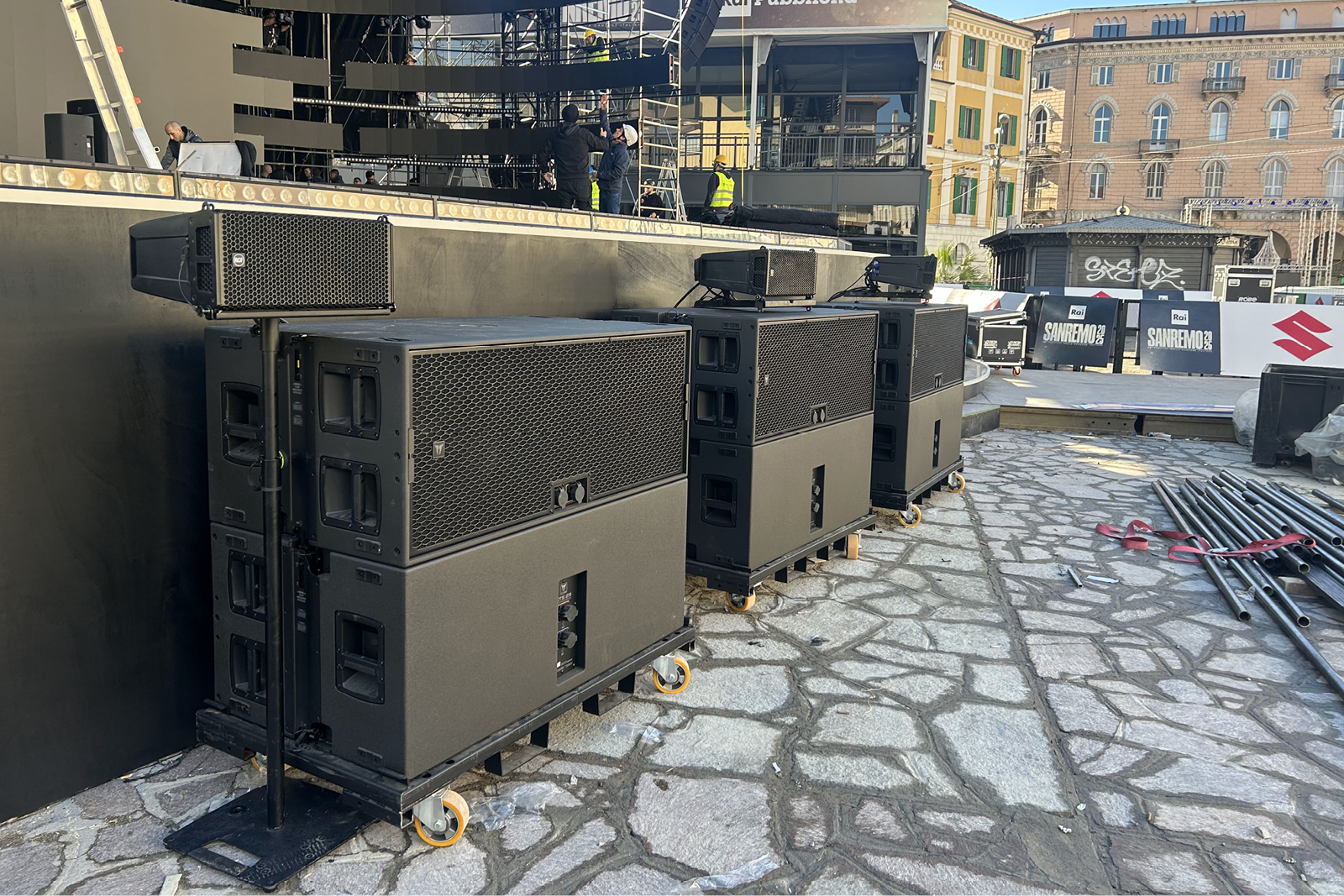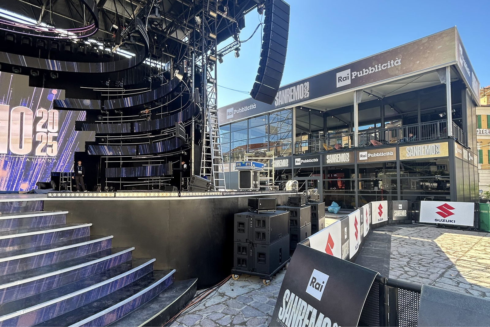 Sanremo’s live events aren’t confined to the main stage at Teatro Ariston – the city comes alive with music. In Piazza Colombo, the heart of Sanremo, an outdoor stage sponsored by Suzuki hosts performances that run together with the main show. The main PA featured [24] modules of TT+ Audio GTX 12 line array, supported by [12] high-performance GTS 19 subwoofers and powered by robust XPS 16K amplifiers. Complementing the main arrays, [18] additional RCF HDL 26-A line array modules were strategically placed to provide even sound coverage throughout the expansive space, ensuring consistency and depth regardless of audience position.