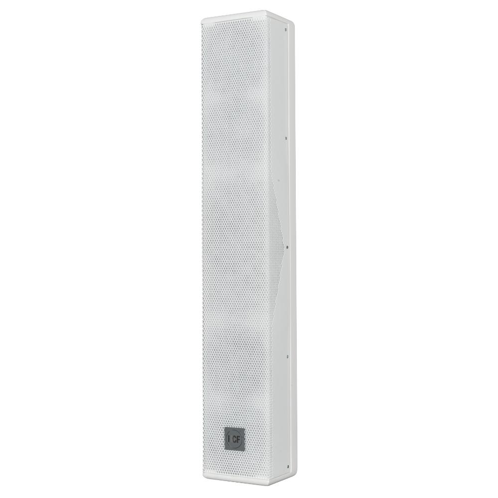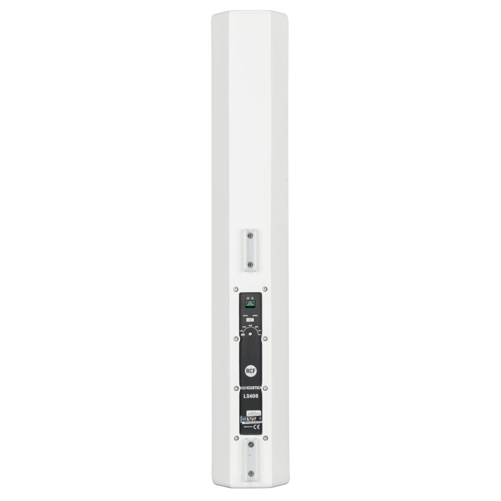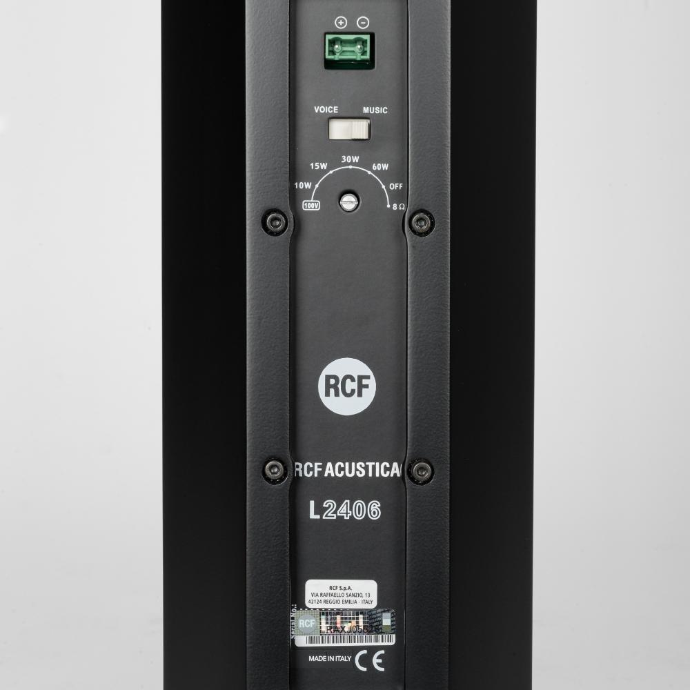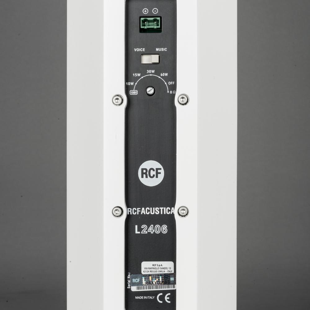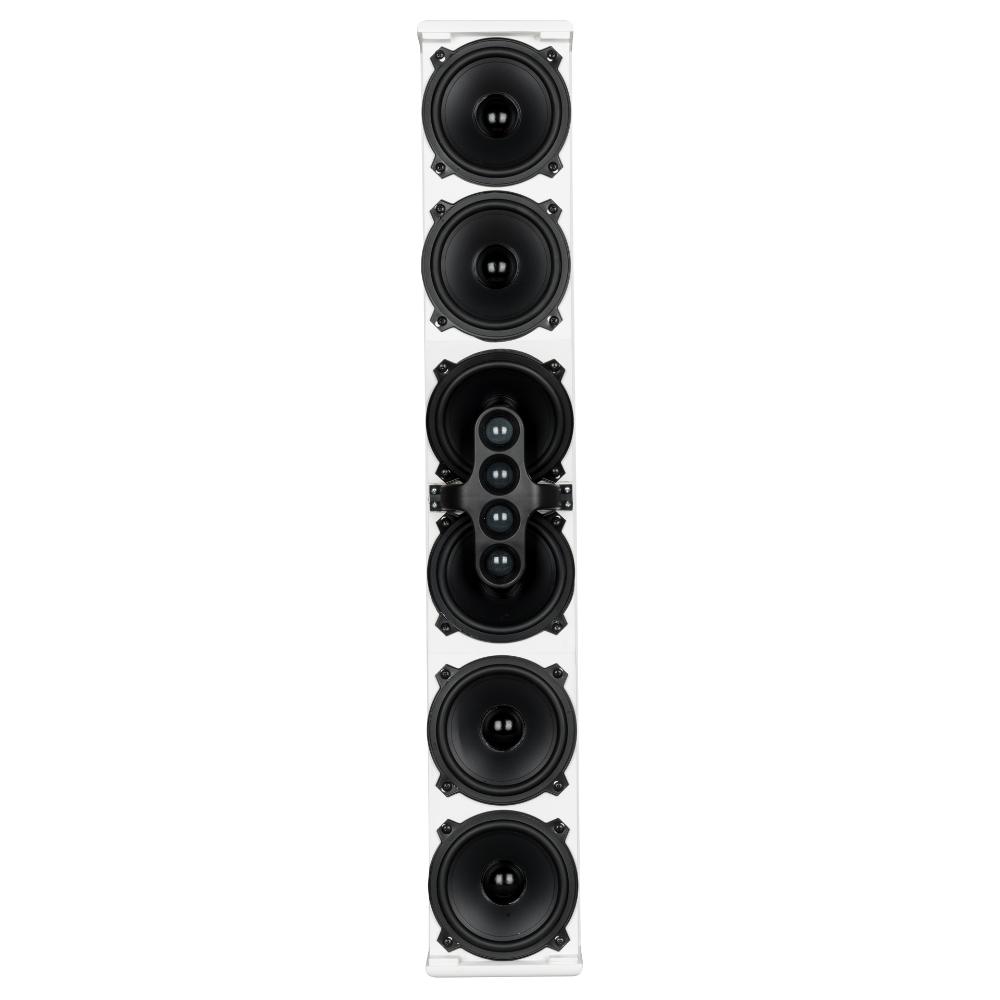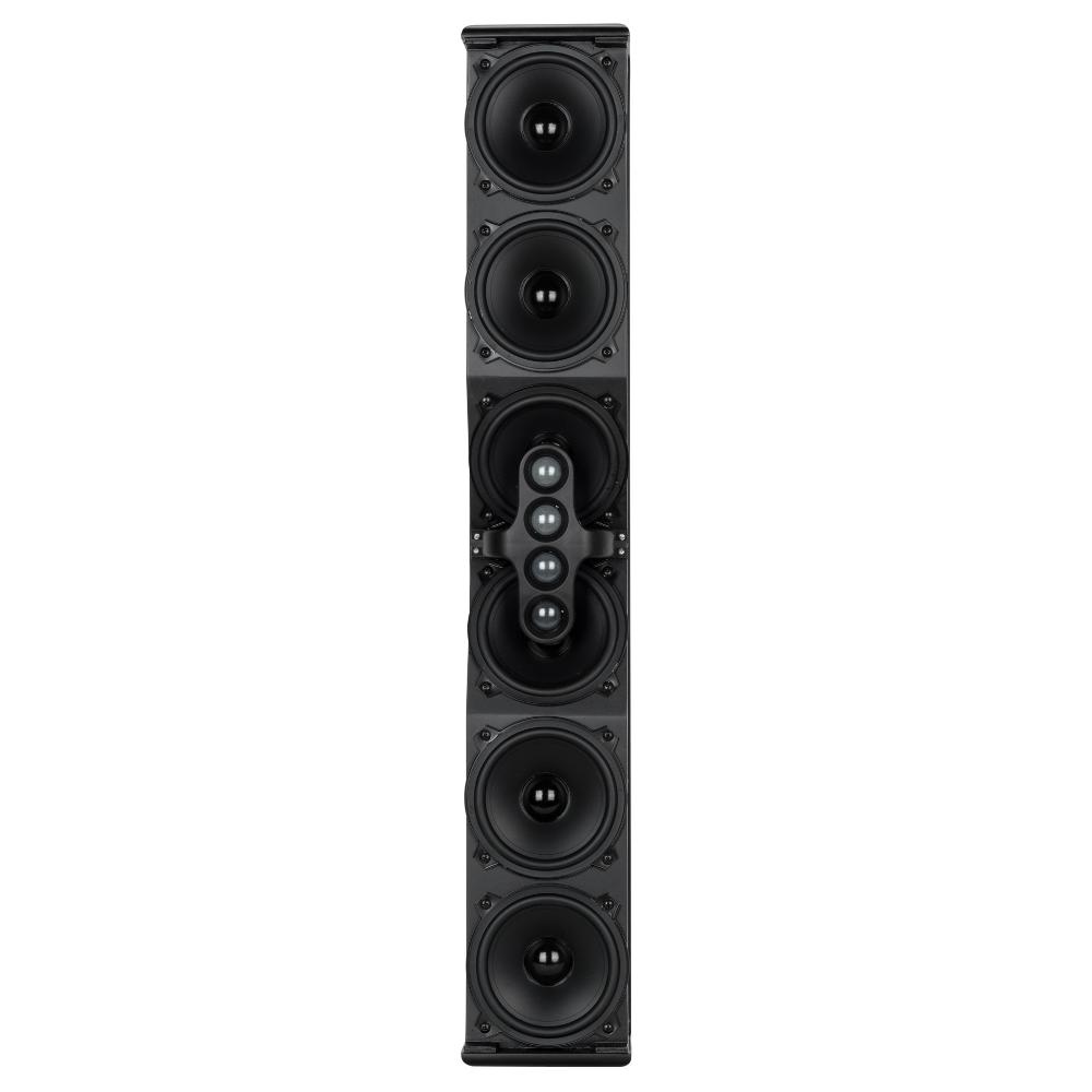 The L2406-T is a full range high intelligibility compact 3 way column speaker array with vertical controlled directivity for medium to large size installations. It is equipped with six 5" woofers and four 1" dome tweeters mounted in front of the two central woofers. This particular design permits coherent sound dispersion minimizing lobing in a very compact enclosure. The two central woofers are controlled differently from the other four because of the tweeters in front of them, in order to improve the directivity providing a true cardioid column operation.The wide coverage horizontal angle and the controlled vertical dispersion allow correct sound reproduction serving a wide area and assistance in limiting feedback and reverberated sound. A speech filter can be activated for enhancing the voice frequencies and improving speech intelligibility. The crossover is designed to avoid secondary lobing creation. Mounting accessories are provided and are designed to keep the column as close as possible to the wall and simplify the installation allowing suitable tilting. The L2406-T can be used connected to a low impedance amplifier to handle 200 W RMS power. It also includes a 60 W line transformer for 100 V systems. The crossover is equipped with a circuit to protect the four 1" dome tweeters.