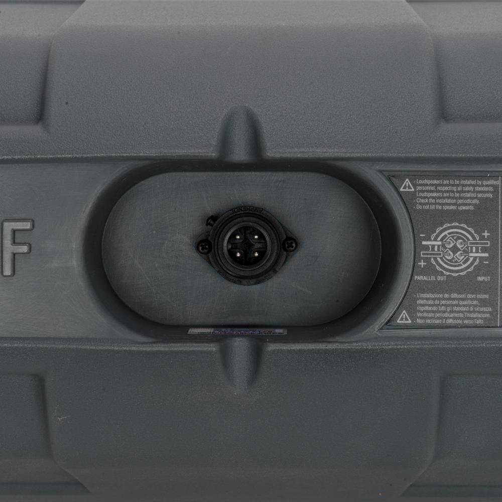 The P 3108 is a weatherproof full-range, two-way speaker, suitable for a variety of professional indoor or outdoor applications. The high-frequency section includes a constant directivity CMD horn loaded with a 1.5" dome RCF Precision neodymium compression driver. The low-frequency section features an 8" woofer with a 2.5" voice coil. Internal circuitry provides LICC crossover and Active Mosfet Compression Driver Protection (AMCDP). The single-piece roto-molded cabinet is fully UV-protected and meets IP-55 standard requirements. It is equipped with M8 (4x) brass inserts and one corrosion-resistant 316P stainless steel U-bracket. Connections to the amplifier are made through a watertight multi-pole connector. The front aluminum grille cover is powder coated and protected with a water-repellent backing material. The logo plate is rotatable.